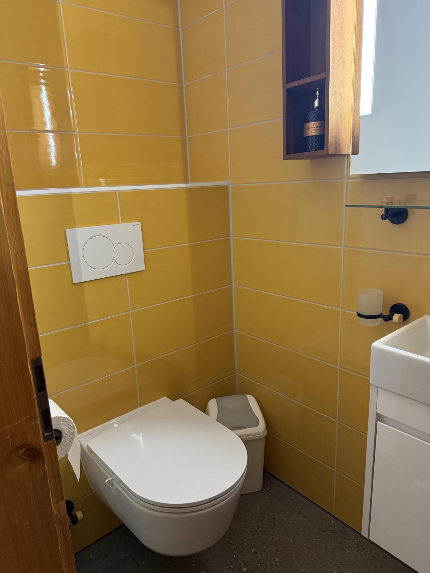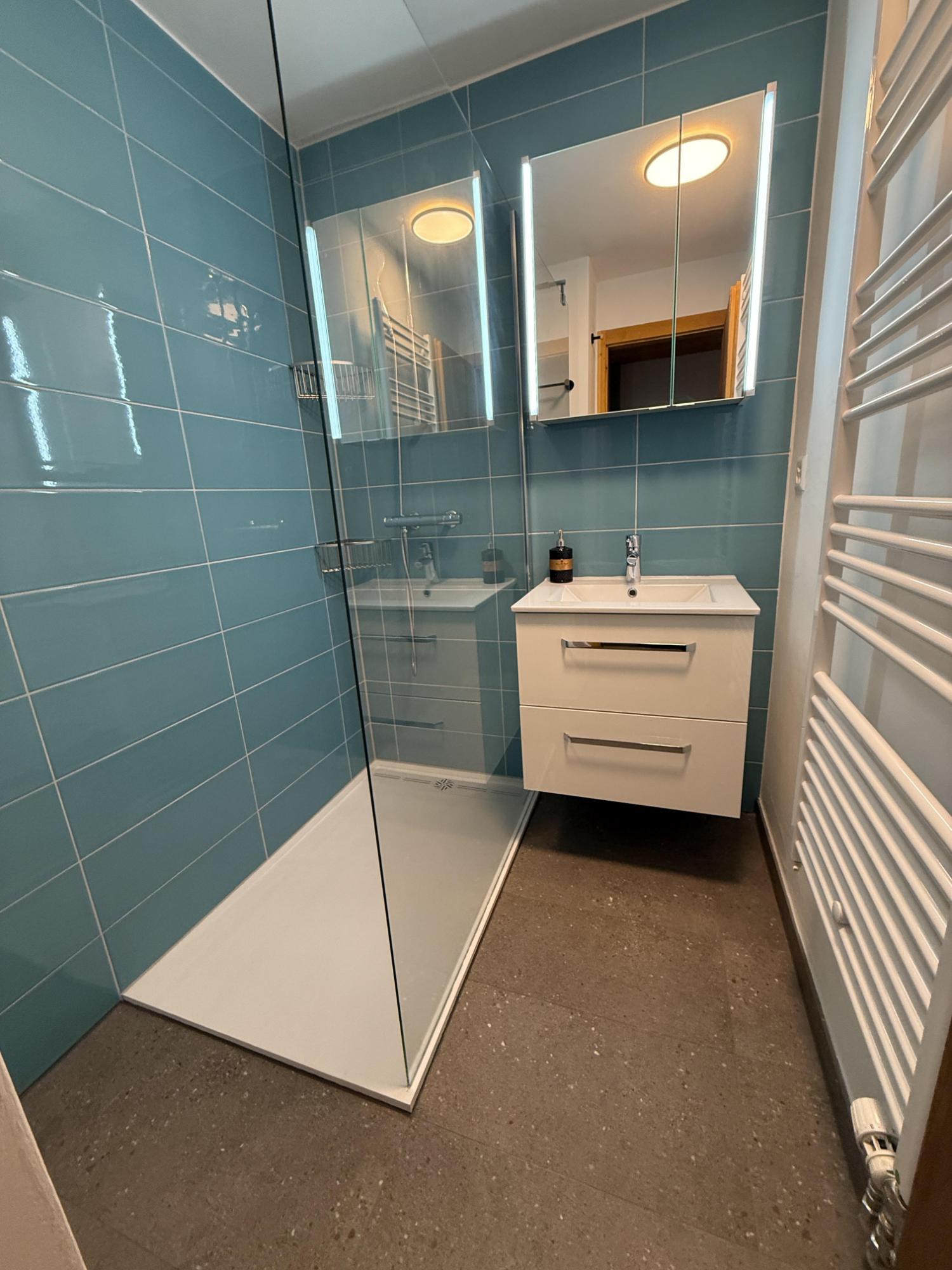 L'appartement dispose d'une chambre double avec un lit double (160) pour un repos paisible. Une petite chambre style cabine, fermée avec un rideau, offre un lit à étages, idéal pour les enfants ou les amis. Une salle de bains avec douche et des toilettes séparées se trouvent à l'entrée de l'appartement.